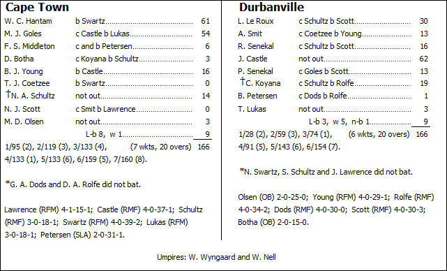 Next over Hantam crashed a six and two fours off consecutive deliveries from Durbanville skipper Nathan Swartz to reach a 35-ball fifty of his own, and after 14 overs Cape Town were looking good at 133-3. However, Swartz bounced back strongly, castling Hantam (61 off 42 balls, with two sixes and nine fours) as the first of two wickets in his final over while conceding just a single as well. Thereafter only a brief counterattack by Young, striking a six and two fours off the start of the 18th over, really came close to providing the big finish that Cape Town would have been eyeing. Instead, Durbanville closed things off nicely by conceding just seven singles from the final 15 balls of the innings, leaving the door open just a crack for themselves. However, Castle duly ensured that this opportunity would not be wasted.