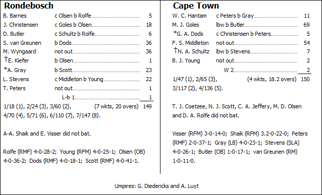 However, Fletcha Middleton had by then been at the crease for a couple of overs, and was now ready to pick up where he had left off against Kraaifontein earlier in the day. Taking on the spinners with devastating effect, the next three overs consequently surrendered 36 runs as he and Goles rocketed to a fifty partnership in just six overs. Although Goles fell immediately thereafter, allowing Rondebosch to rally somewhat and bowl three consecutive tight overs that conceded just eight runs between them, it still left Cape Town needing an eminently-achievable 25 from four overs – especially as Middleton still remained. He proved it as well, cracking the first two balls of the penultimate over for four and then six to clinch the win and bring up his second fifty of the day, this one needing 33 balls to complete and including three sixes and five fours.
