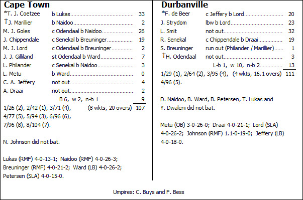 Chasing barely five to the over for victory from the outset, Durbanville never found themselves under the same kind of pressure.  True, it took an audacious reverse-sweep off the final delivery to prevent the innings beginning with a maiden, but thereafter Durbanville skipper Fritz de Beer added two further fours and a six in the space of four balls, powering his side to a perfect start of 29 without loss from the first four overs.