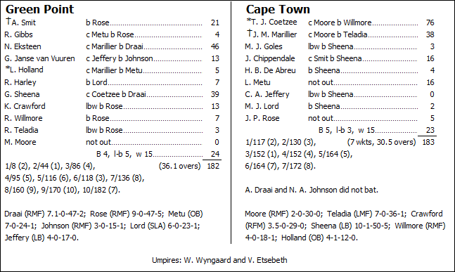 Chasing a moderate victory target of just 183 after bowling their hosts out 50 minutes prior to the scheduled lunch break, and then replying by rocketing to 68-0 from just seven overs in the time remaining before the interval was taken, the visitors could scarce have penned a script that gave themselves a better start. Captain Tristan Coetzee and his new opening partner Jamie Marillier ensured that none of the momentum gained from their earlier fielding effort dissipated, with Coetzee being especially savage – he smashed seven fours from the opening three overs.  Once Marillier therefore also started getting in on the act, their fifty partnership was raised in barely 4½ overs. Any Green Point hopes that the lunch break might reset the scale and give them some chance of getting back into the contest proved unfounded, as Coetzee and Marillier merely continued on their merry way after the resumption. Coetzee stormed to a 34-ball fifty with his tenth four, and at 115-0 after just 13 overs, a very solid foundation for a resounding win had been laid – just 68 more needed at less than two to the over, with all ten wickets in hand.