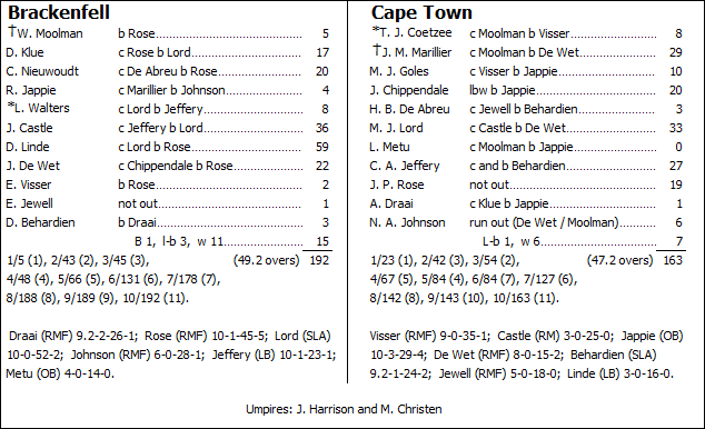 As had happened the week before against Victoria at the same venue, the home side began splendidly, taking advantage of initially humid and overcast conditions to reduce Brackenfell to 48-4 by the first drinks break. Their young Lancashire import Jaden Rose had broken a stump in castling his first victim in his opening over, and had added a second scalp too by that point. The visitors tried to consolidate, batting carefully as the next nine overs brought just singles, but the arrival of Divan Linde at the crease at that juncture provided an injection of momentum into proceedings. It should not have done, as he was dropped before he had scored, but having survived that chance, he and Jaco Castle set about turning the tide by adding 65 together in 15 overs for the sixth wicket.