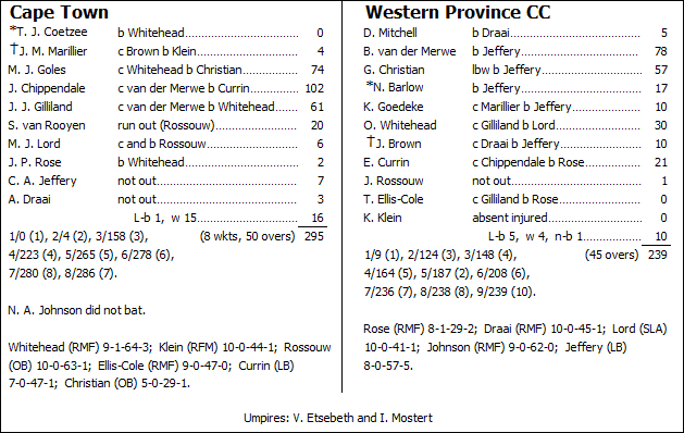 It was a tall order to ask from any side, much less one as inexperienced as the home side had available (the last time that Cape Town faced WPCC, in January, the latter had fielded a side with a combined total of 135 appearances against Cape Town – their team in this match could manage just 71, including three fixture debutants). And the quick loss of the experienced Derek Mitchell in just the second over of their reply – the only player in the side to have made either 20 appearances or 400 runs against Cape Town – was a telling blow from the outset.