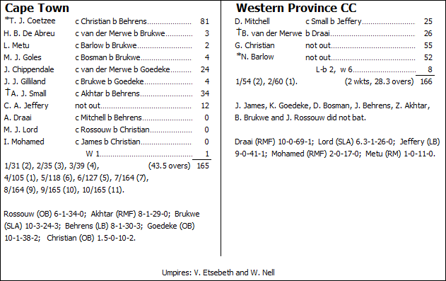 Visiting skipper Nick Barlow arrived ready to pounce instantly on any opportunity to score, and consequently proceeded to drive and pull five fours in his first seven overs at the crease. Christian at the other end started off more conservatively, picking up a swath of ones and twos to still post the fifty partnership with his captain at a-run-a-ball tempo. As a result, by the drinks break WPCC required just 50 more runs from 29 overs – but the batting pair had zero intention of taking things anywhere near that deep. With the home side again having limited bowling options available, Barlow and Christian cashed in to crunch six fours in 30 runs from three overs straight after the break, and two overs later both completed their individual fifties (from 49 and 46 balls faced respectively) and posted their hundred partnership (from just 93 balls), all in the course of the same over. That left just five runs wanted from 23 overs, and those runs were easily picked off without effort to seal a dominant bonus-point win that kept WPCC at the top of the points table, and Cape Town firmly at the bottom.