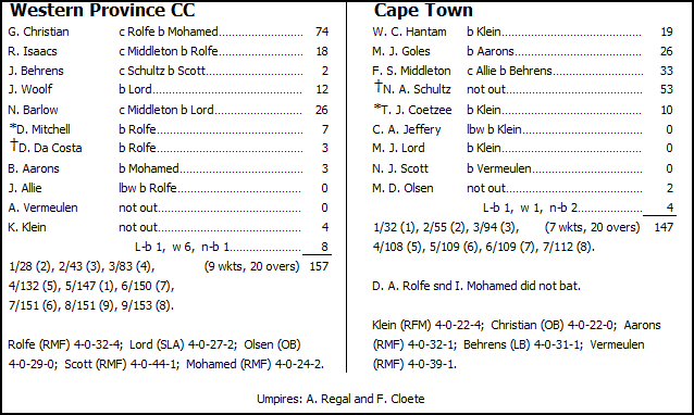 All of this kept the WPCC run rate ticking along merrily at a very healthy 8½ runs per over consistently throughout the whole innings, with eight sixes and nine fours having been taken from the first 17 overs. However, once Imraan Mohamed, who had last played for the First XI a week short of a year previously, had Christian caught on the boundary for 74 from 54 balls in a very effective second spell of 2/9, opening bowler Darren Rolfe then pulled a little back for Cape Town at the death – claiming three wickets in his final over. Cape Town was thus able to steal WPCC’s finishing flourish, restricting them to 10-5 from their final three overs.