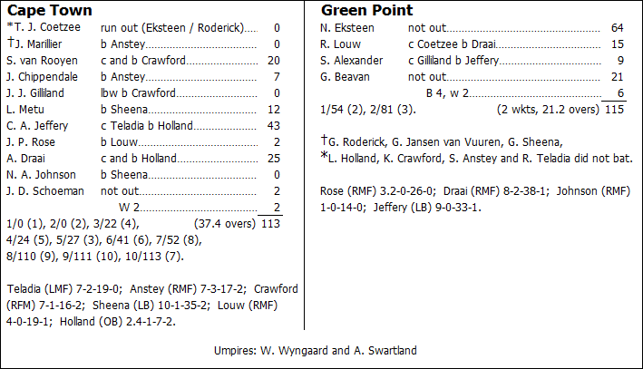 Cape Town did at least manage to pick up a belated wicket just before the lunch break, and Jeffery bagged his 50th First XI career scalp some 20 minutes after the resumption, but by then Eksteen had cruised unstoppably to a 40-ball fifty, and it was all just a matter of waiting until the winning runs were hit. Gareth Beavan joined Eksteen to ensure that this would not be unduly long in coming. In fact, Eksteen actually slowed down noticeably after reaching his fifty, hitting no boundaries at all in the first eight overs after Beavan had joined him, but he still finished with a run-a-ball undefeated 64 from 65 balls (including ten fours and a six). The victory target was consequently achieved with almost 30 overs still in hand, giving Green Point the bonus-point win that kept them advancing up the points table – even as Cape Town stayed mired in the looming shadow of the relegation zone.
