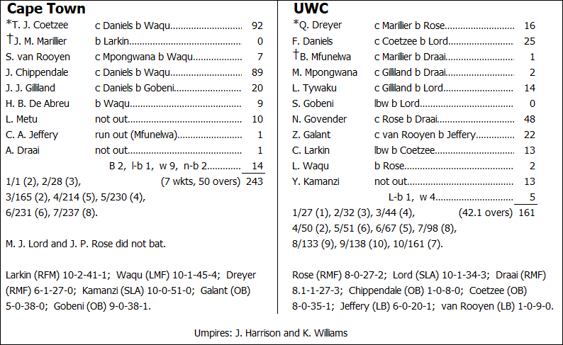 The home side began their run chase confidently after the lunch break though, moving smoothly to 25-0 from the first six overs. But then two outside edges were snapped up in the space of five deliveries, and when Alex Draai struck for the second time in his first three overs, the students were left in some disarray at 44-3. Opening bat Fayaad Daniels looked to be digging again though (in their previous encounter at this venue, he had been an unmoveable presence at the crease for all of 39 overs) – until left-arm spinner Michal Lord had him slash to slip, before following this up with another wicket in his next over and a third two overs later. That left UWC poised on the precipice of disaster at 67-6 after 19 overs, and the game had effectively been won and lost.